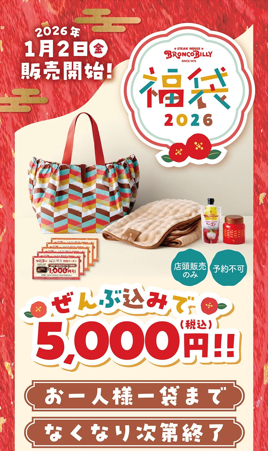 2026年1月2日(金)より、売切れ必至の「ブロンコビリー福袋」を販売開始!
